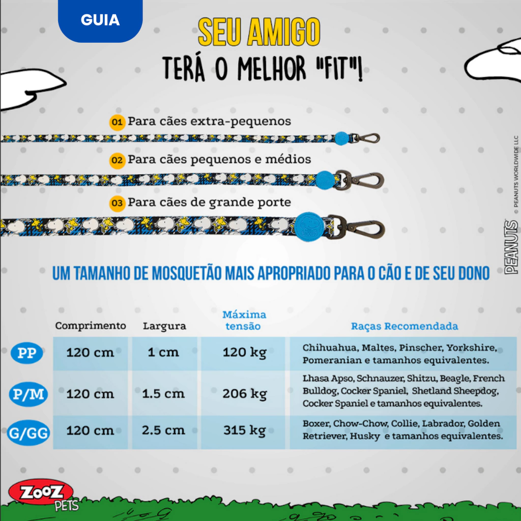 Feito com a última tecnologia de impressão, as Guias, e todos os acessórios Zooz Pets tem um design marcante, divertido e com super nitídez do personagem Snoopy.