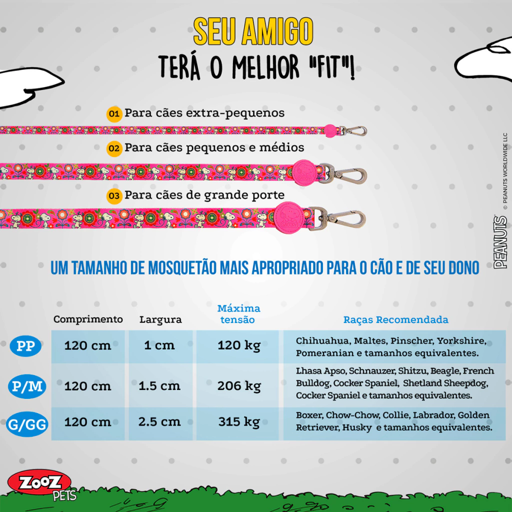 Feito com a última tecnologia de impressão, as Guias, e todos os acessórios Zooz Pets tem um design marcante, divertido e com super nitídez do personagem Snoopy.
