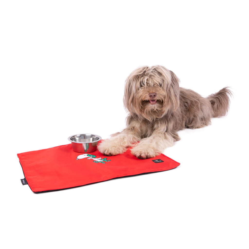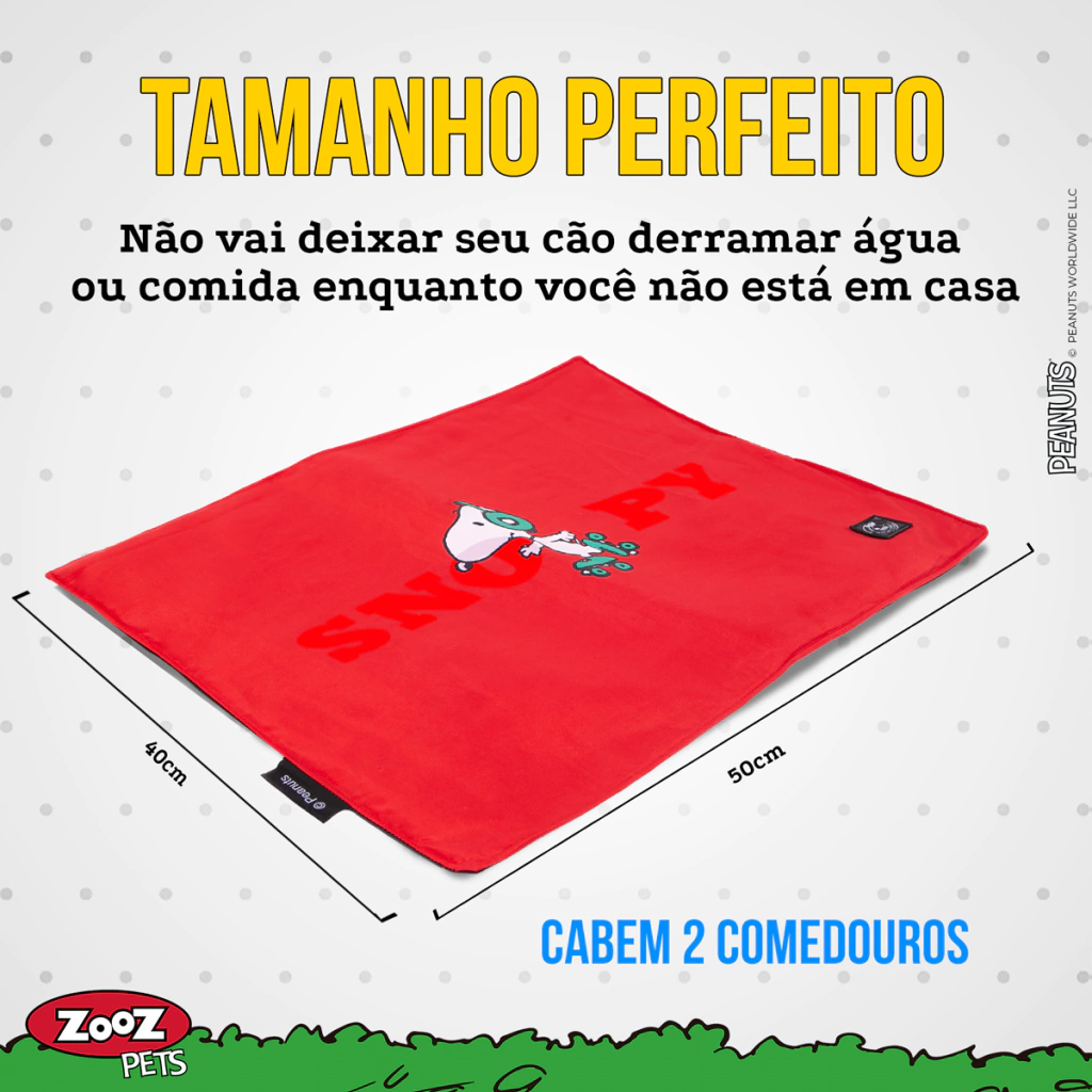 No tamanho único de 40cm de largura e 50cm de comprimeto, cabem até 2 comedouros e além de conter uma ótima absorção. A parte de baixo é feita de patinhas anti-derrapante de borracha, fixando melhor no chão.