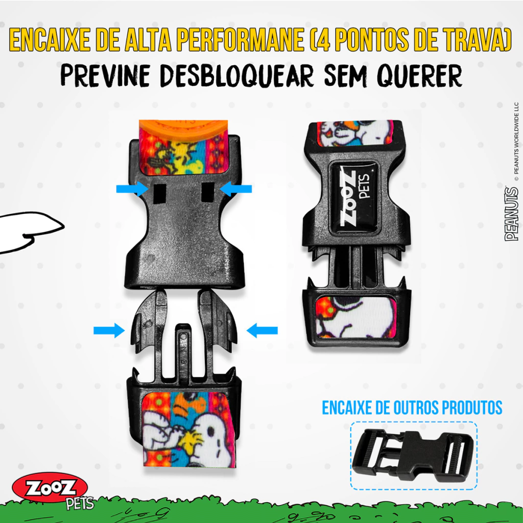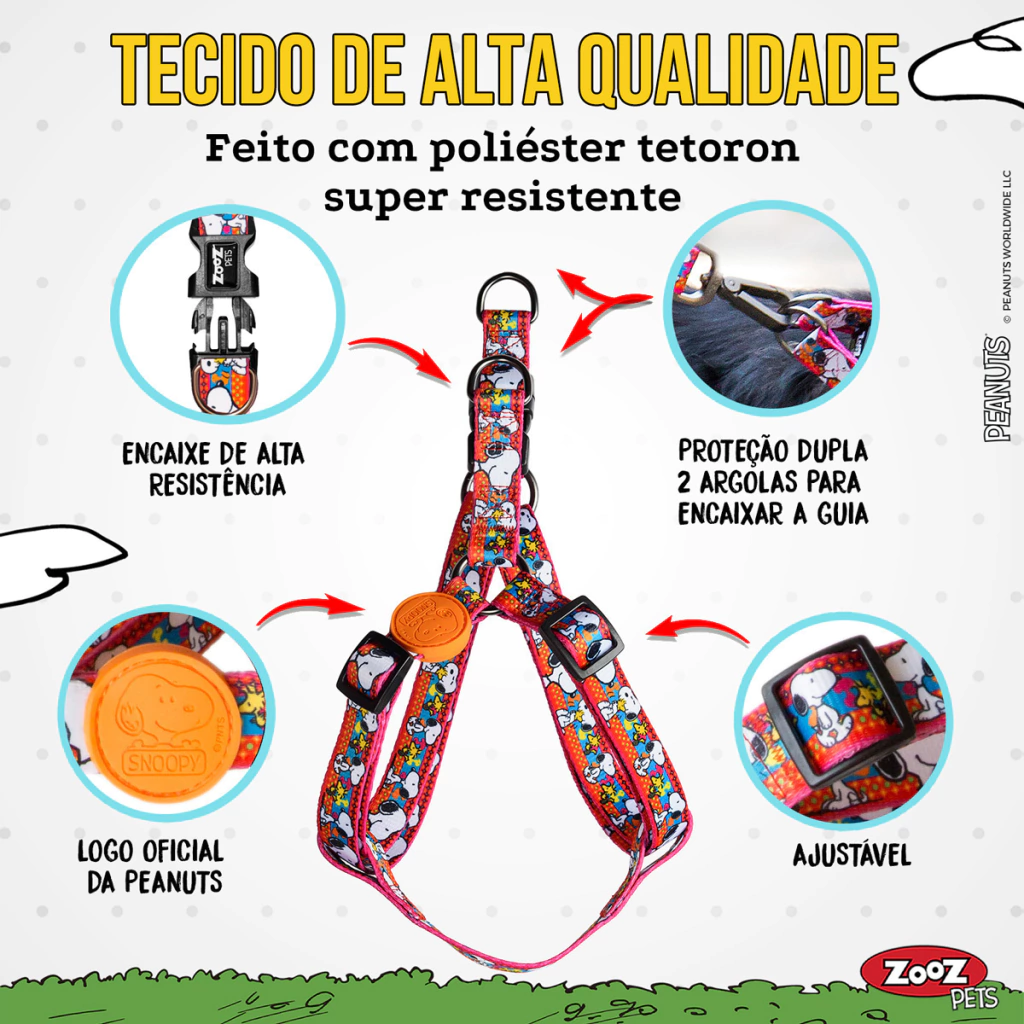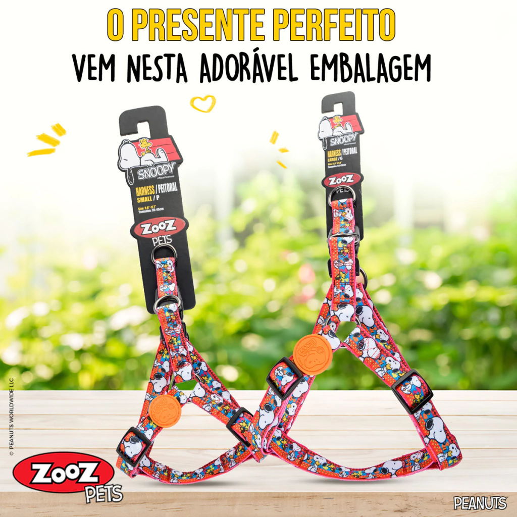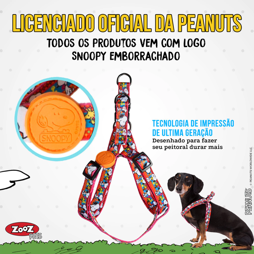 Feito com a última tecnologia de impressão, as Peitorais, e todos os acessórios Zooz Pets tem um design marcante, divertido e com super nitídez do personagem Snoopy.